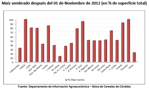 En diciembre de la presente campaña los milímetros acumulados fueron marcadamente mayores a lo de la campaña 2011/2012; por el contrario, enero de 2013 las lluvias acumuladas se vieron disminuidas respecto al mismo periodo del año pasado afectando de esta manera a los cultivos de siembras tardías.