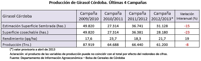 La producción de girasol en la provincia de Córdoba se estima en 61.200 Tns., un 8% inferior respecto al año pasado