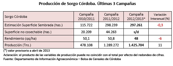 Cálculos preliminares de producción de sorgo 2012/2013 en Córdoba realizado por el Departamento de Información Agroeconómica indican una producción de 1.425.704 Tns., un 11% superior a la campaña pasada.