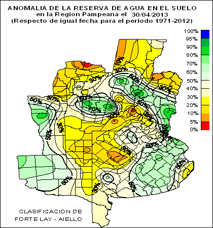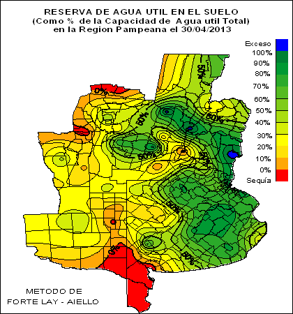 RESERVA DE AGUA ÚTIL EN EL SUELO (como % de la capacidad de agua útil total) en la Región Pampeana el 30 de Abril de 2013