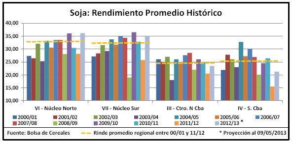 Distinto es el panorama hacia el oeste, el rinde medio calculado para las zonas Centro Norte y Sur de Córdoba se encuentra por debajo del promedio registrado durante las últimas doce campañas, y ello es consecuencia del impacto de la sequía estival registrada durante actual ciclo.