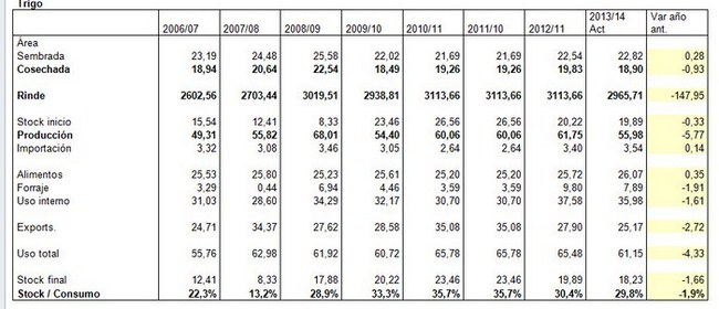De acuerdo a lo informado por la corredora Alabern Fábrega, en trigo, si bien el área sembrada creció marginalmente, por los problemas climáticos se perdieron casi 1 millón de hectáreas (M/Has.) cosechadas respecto al año pasado, y el mal clima fue el elemento de mayor impacto en dicho efecto. Esto hace que la producción merme en forma importante, que baje el uso forrajero, especialmente porque habrá una buena cosecha de maíz, lo que moderaría el impacto en stocks.