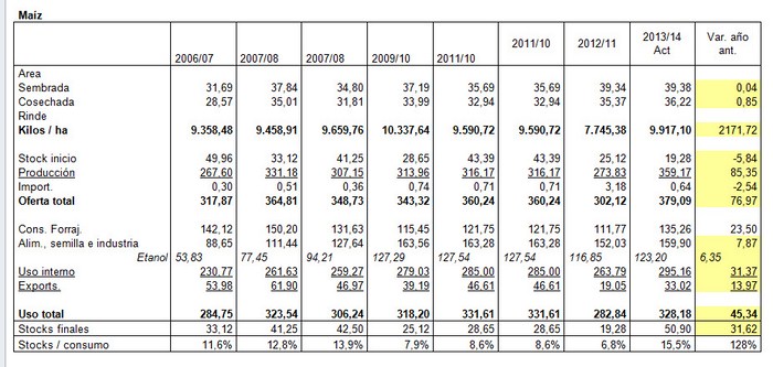 Al mismo tiempo, las existencias finales de maíz estadounidense para 2013/14 llegarían a 2.004 millones de bushels, casi el triple de los 759 millones previstos para el cierre del año de comercialización en curso, el 31 de agosto, y levemente arriba de lo estimado por el sector privado.
