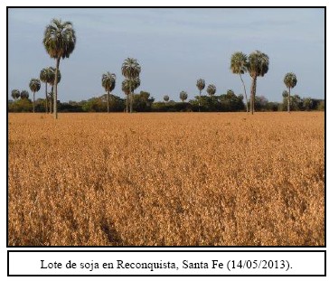 Lote de soja en Reconquista, Santa Fe (14/05/2013). Frente a este escenario, nuestra estimación nacional de área a sembrarse durante el ciclo 2013/14 se mantiene sin variación respecto de nuestra publicación de Pre-Campaña. En conclusión, la superficie a cultivarse sería de 3.900.000 hectáreas, cifra que representa un incremento del área de 8,3 % en comparación a la superficie implantada durante el ciclo previo (campaña 2012/13: 3,6 MHa sembradas). Por otra parte, el inicio de la incorporación de cuadros se dio en lugares muy aislados del norte argentino. Esto se debe a que actualmente la humedad superficial es de escasa a nula en dichas zonas.