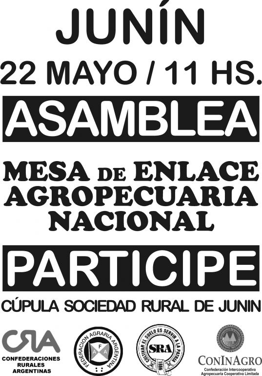 Este miércoles 22/5 a las 11 horas, en el predio de la Sociedad Rural de Junín, provincia de Buenos Aires, la Comisión de Enlace de Entidades Agropecuarias (CEEA) llevará a cabo la última asamblea abierta de productores agropecuarios, y se espera luego la definición de un plan conjunto de medidas de protesta.