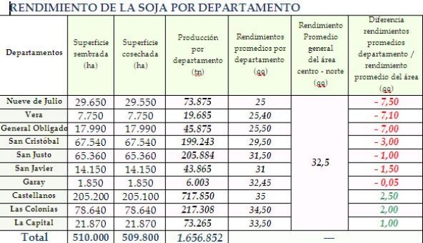 Los rendimientos promedio en los departamentos Castellanos, Las Colonias y La Capital estuvieron por encima del promedio general del centro-norte de la provincia de Santa Fe. El más perjudicado fue el departamento 9 de Julio (25 qq/Ha.), en tanto en Castellano se obtuvieron 35 qq/Ha. (ver cuadro que se adjunta).