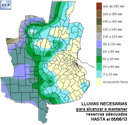 Partiendo de las condiciones actuales de reserva, podemos proyectar la demanda de precipitaciones para alcanzar o mantener niveles adecuados de humedad. El mapa representa esta demanda hasta el miércoles 5 de junio. En el mismo se destaca un requerimiento de lluvias prácticamente nulo sobre gran parte de la franja este de la región pampeana, con algunas zonas del sur de SF algo más necesitadas, pero sin que esto pueda considerarse una situación exigida. La demanda si se vuelve más improbable de ser satisfecha en zonas mediterráneas.