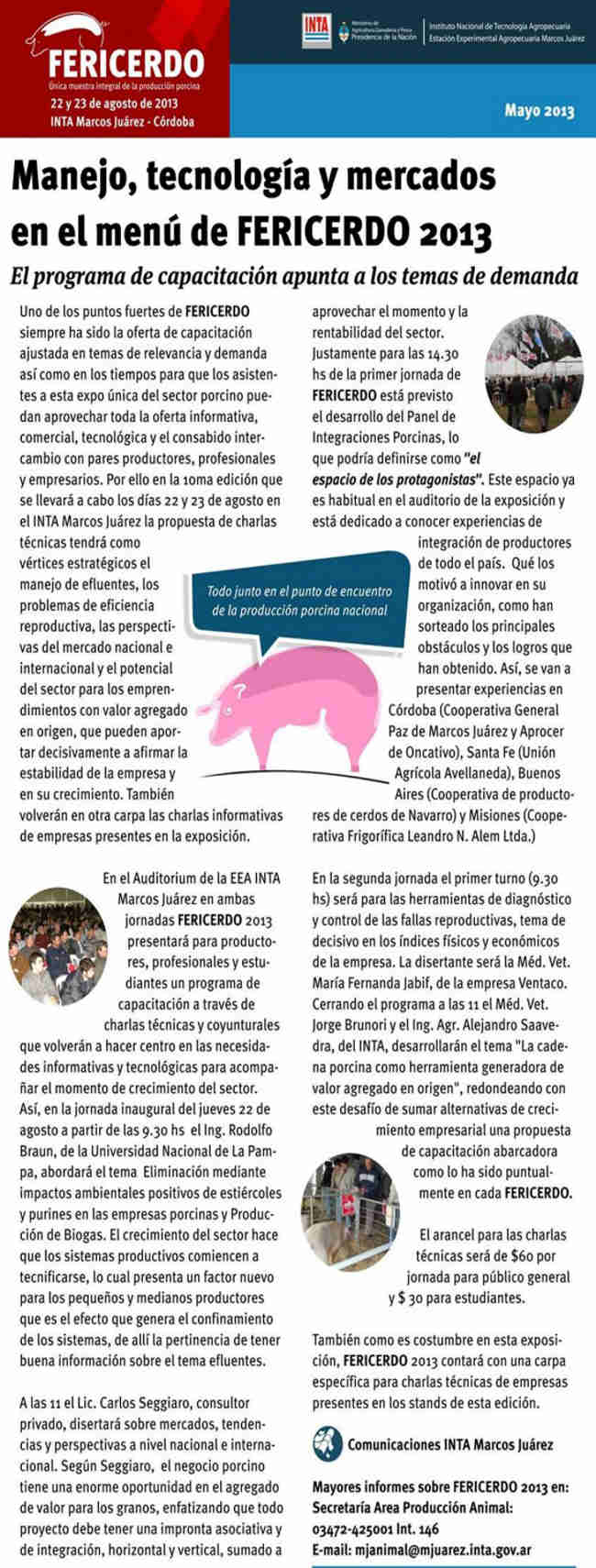 Manejo, tecnologia y mercados en Fericerdo 2013 que se llevará a cabo los días 22 y 23 de agosto en Marcos Juárez, Córdoba. Estrá presente el historiador Felipe Pigna, repasando las diferentes etapas de la agricultura argentina...