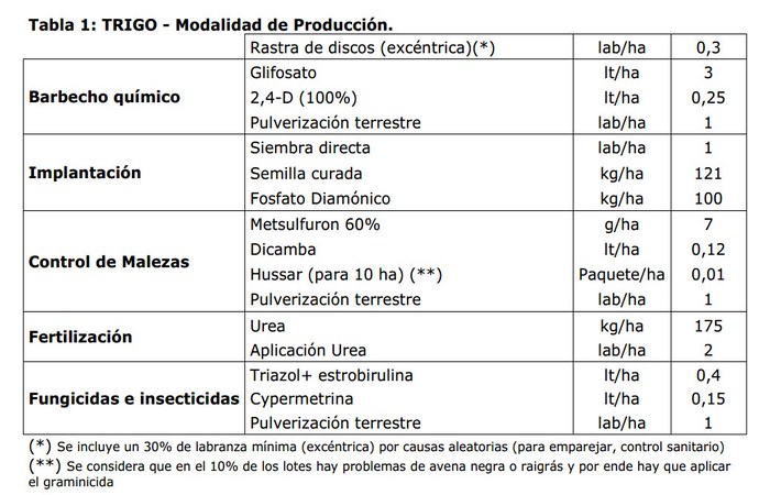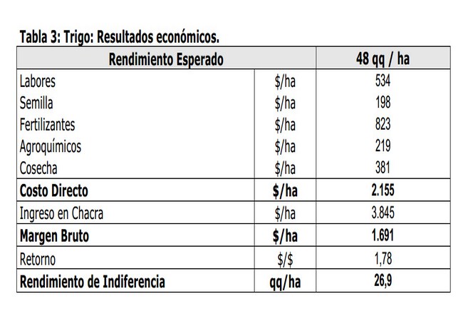 El objetivo es analizar, desde el punto de vista económico, los resultados factibles de obtener en la próxima campaña, para la modalidad deproducción característica del sistema considerado, en siembra directa, considerando como antecesor al cultivo de soja. (Tabla