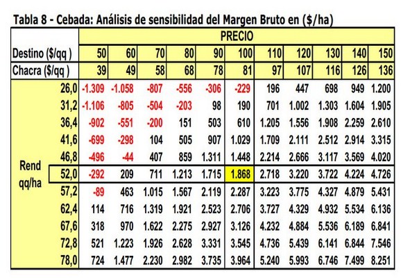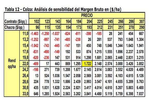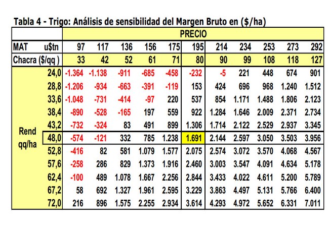 Teniendo en cuenta las posibles variaciones de rendimiento que puedan obtenerse debido a efectos climáticos, las distintas situaciones que puede darse en cada caso particular, y por otro la evolución de los precios esperados de acuerdo al comportamiento de los mercados, se realizó un análisis de sensibilidad del Margen Bruto considerando un rango de valores para rendimientos y precios. Los mismos se presentan en la Tabla 4