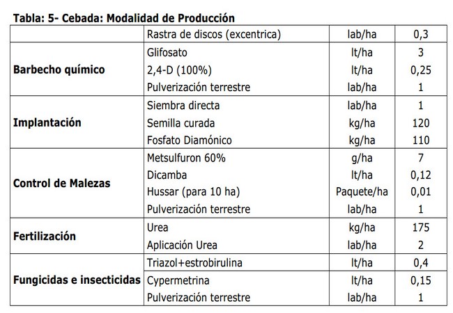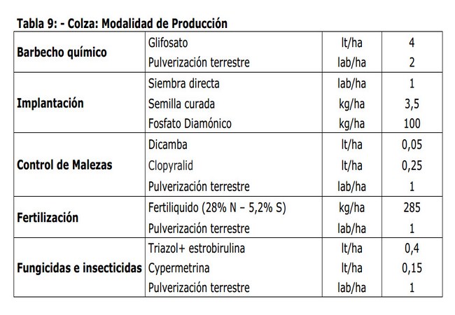 Todos los cultivos se realizan bajo la modalidad de siembra directa, presentándose las estimaciones de resultados de los cultivos de trigo, de cebada cervecera y de colza, como también de algunas combinaciones de doble cultivo con soja de 2ª. Dichas estimaciones se realizan para los rendimientos medios esperados para los niveles tecnológicos aplicados, a lo que se agrega un análisis de sensibilidad por variaciones de rendimientos y precios.