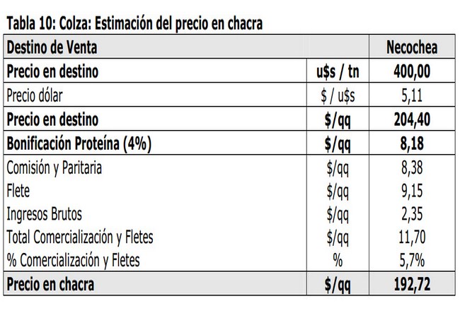 El precio de la colza se calcula a partir de un valor de referencia fijado por el comprador, que se ajusta en función a las variaciones de la cotización de la posición Diciembre 2013 del mercado de París (Matif) a marzo de 2013 y la relación Euro/Dólar del mismo período, lo que da un precio de 400 u$s/ton.