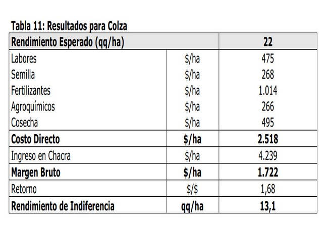 Para la modalidad presentada se estimaron los resultados considerando dos rendimientos esperables, en función del adelanto en la fecha de siembra de acuerdo el cultivo antecesor. Se consideró para una soja sembrada atrás de trigo (se siembra no más de un 70% del trigo con soja de 2da) un rendimiento de 12 qq/ha y para cebada y colza un rendimiento de 15qq de soja de 2da (se siembra el 100% de la superficie)