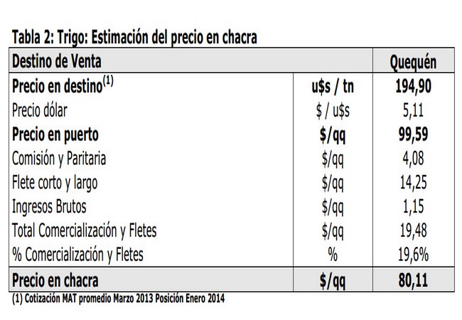 Para estimar el precio en chacra se tomó para la posición Mayo 2014 el promedio de las cotizaciones del Mercado a Término de Buenos Aires durante el mes de Marzo (U$S 304 por tonelada). Esto da un precio en Quequén de 155,34 $/qq, gastos de comercialización y flete de 24,04 $/qq lo que resulta en un precio en chacra de 131,31 $/ha.
