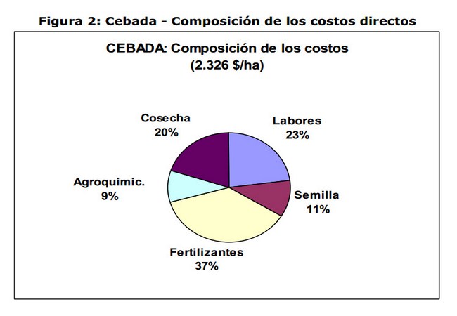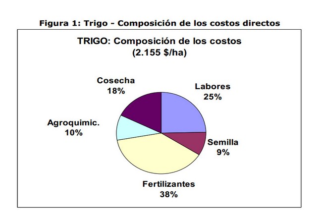 Dentro de los costos directos, la participación de los fertilizantes fosforados y nitrogenados presenta la mayor importancia relativa, representando un 38% Por ello, el uso eficiente de este recurso resulta clave en el resultado final dela actividad. Dentro de agroquímicos se incluye a los herbicidas, fungicidas e insecticidasaplicados. (Ver Tabla 1)