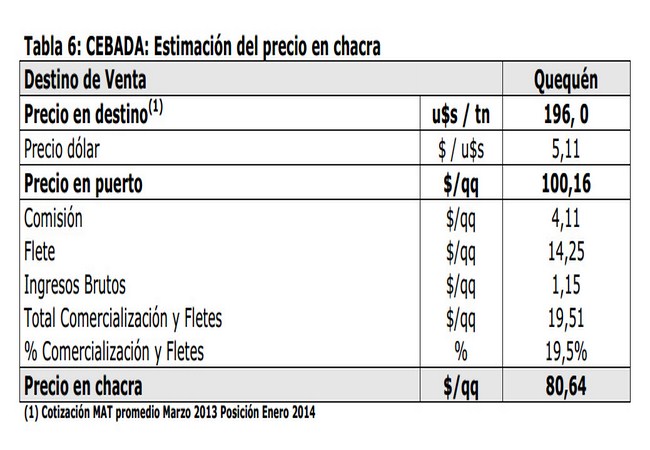 Para el precio de la cebada se consideró para la posición Enero 2014 el promedio de las cotizaciones diarias del Mercado a Término de Buenos Aires durante el mes de Marzo.