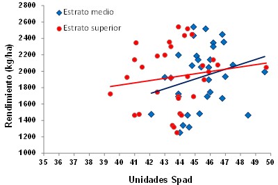 Figura 6: Relación entre los rendimientos y la intensidad de verde por Spad en el estrato medio y superior del cultivo de colza.