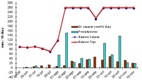 Figura 1: Evapotranspiración, precipitaciones y balance hídrico, expresados como lámina de agua útil (valores positivos) o déficit de evapotranspiración (valores negativos) para cv de cebada y trigo. Valores acumulados cada 10 días en mm. Año 2012. Lámina de agua útil inicial (140 cm) 90 mm, no se registró défict durante todo el ciclo.