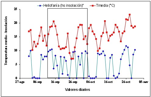 Figura 2: Horas diarias de insolación y temperaturas medias diarias en Pergamino, durante el período comprendido entre 1 de Setiembre y 1 de Noviembre de 2012. Véase las continuas caídas de insolación, por la frecuencia de días nublados y con precipitaciones.