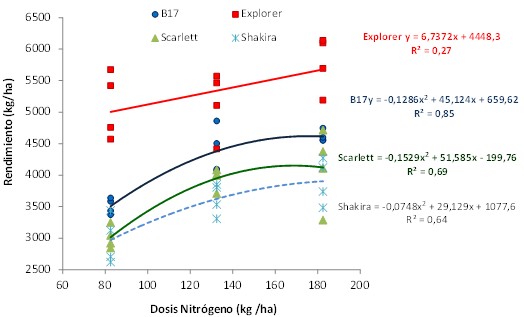 Las variedades de cebada y el trigo respondieron positivamente a la fertilización nitrogenada hasta la dosis máxima de N 100 (Figura 4). El elevado potencial de respuesta a nitrógeno en la región ha sido documentado anteriormente por Prystupa et al, (2010) y Ferraris et al., (2012). Si se comparan las funciones lineal y cuadrática, solamente no fue significativa la función cuadrática para el cultivar Explorer (Tabla 6). Esta variedad sostuvo altos rendimientos sin fertilización, por lo cual fue menor su eficiencia de uso de N (EUN). Baguette 17, Shakira y Scarlett mejoraron leve a moderadamente el ajuste con una función cuadrática, y alcanzaron elevadas EUN (Tabla 6).