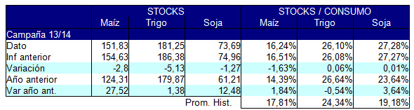 De todos modos, a pesar del deterioro estimado en los cultivos, se aguardan stocks para la campaña 2013/14 muy superiores, los cuales repercutirían en una baja notable de los precios a partir de 2014.