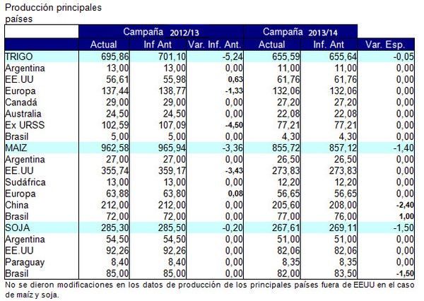 Sin embargo, el organismo observó un cambio en los stocks esperados para la campaña norteamericana 2013/14. De acuerdo a lo informado por la corredora Alabern Fábrega, ese sería el dato más observado del reporte. “Allí lo que se ve es que se aguardaba un ajuste a la baja de casi 5 mill.tt. pero sólo fue de 1,4 mill.tt. El mercado se lleva así una sorpresa bajista: está 4,9 mill.tt. por debajo de lo esperado.”, afirmó Dante Romano de la corredora Alabern.
