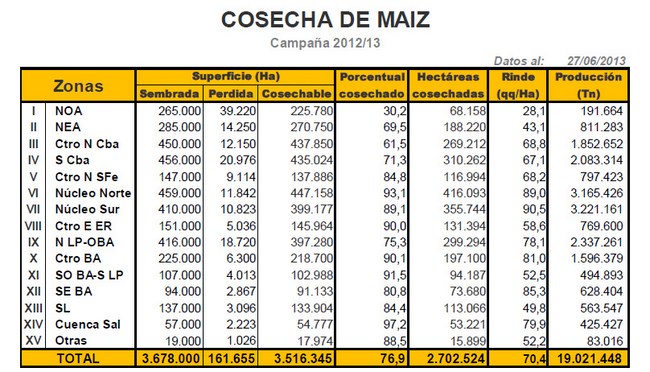 La recolección de maíz con destino grano comercial avanzó en los últimos ocho días 5,1 puntos porcentuales, registrando así un 76,9 % avance de cosecha a nivel nacional, que en números absolutos supera los 2,7 millones de hectáreas ya recolectadas. A la fecha, el volumen de grano acumulado es de 19 millones de toneladas, logrando así un rendimiento promedio a nivel nacional 70,4 qq/Ha.