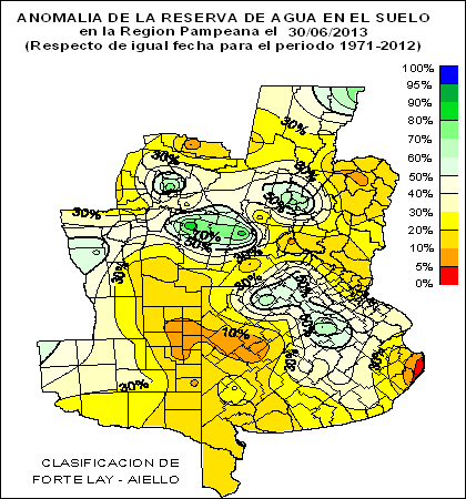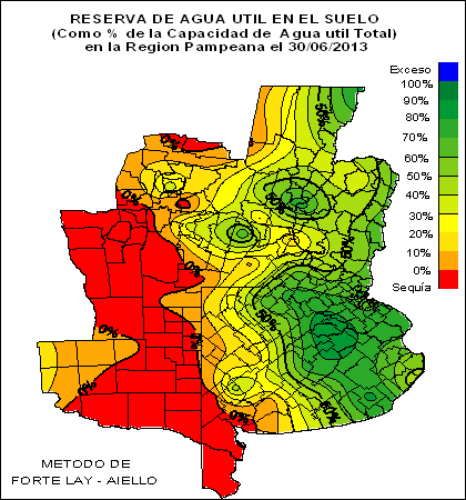 RESERVA DE AGUA ÚTIL EN EL SUELO (como % de la capacidad de agua útil total) en la Región Pampeana el 30 de Junio de 2013