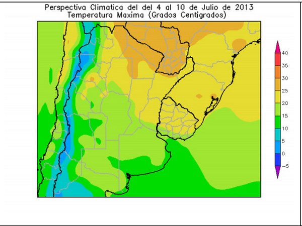 • La mayor parte del Paraguay, el norte del sur del Brasil, el este de Salta, la mayor parte de la Región del Chaco, el norte de Corrientes y el nordeste de Santiago del Estero, observarán temperaturas máximas superiores a 25ºC.