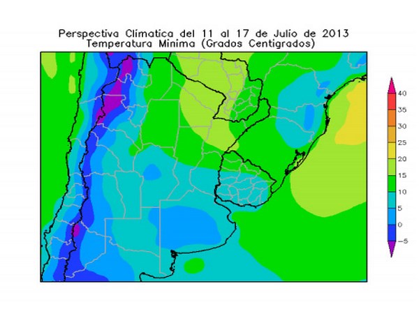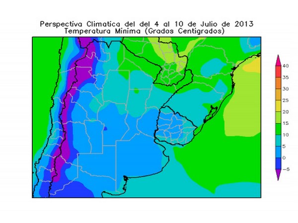 • El centro del NOA; el este de Cuyo, la mayor parte de la Región Pampeana, la mayor parte del Uruguay, el este de Sao Paulo, la mayor parte de Santa Catarina, Paraná y el norte de Río Grande do Sul, observarán temperaturas mínimas entre 5 y 10ºC.
