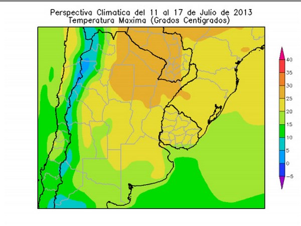 • El centro del NOA; el este de Cuyo, la mayor parte de La Pampa, el este y el sur de Buenos Aires y el sudeste del Uruguay, observarán temperaturas máximas entre 15 y 20ºC.
