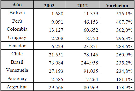 Como si estos datos no fueran suficientes para evidenciar el desperdicio de una década, al comparar la evolución de las ventas externas de nuestro país con la de las demás economías de nuestra región, los resultados son más que elocuentes. En forma concreta, Argentina fue la nación que menos incrementó sus exportaciones totales entre 2003 y 2012. Si bien la tasa de expansión fue del 174%, se ubica muy por detrás de los incrementos en Bolivia (576,1%) y en Perú (407,7%) y Colombia (407,7%) que presentan las expansiones más destacadas.