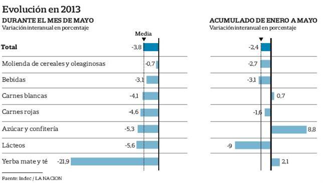 Según el Instituto Nacional de Estadística y Censos (Indec), en mayo (último dato disponible) la industria alimentaria registró una caída interanual de 3,8%, que respondió a una baja en todas sus ramas. Para el acumulado de enero a mayo, la baja frente al mismo período del año anterior fue de 2,4 por ciento. Los sectores que mostraron los peores resultados en los primeros cinco meses del año fueron lácteos (-9% interanual), bebidas (-3,1%) y molienda de cereales y oleaginosas (-2,7%).