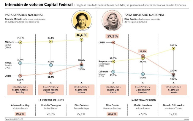 El diario de mayor circulación en todo el país se ata al posible resultado de las internas en UNEN para hablar de tres posibles panoramas. En cuanto a las elecciones para senador nacional, siempre ubica en primer lugar a Gabriela Michetti (PRO). Mientras que en la batalla por conseguir las bancas en la Cámara de Diputados, ubica con grandes chances a Elisa Carrió y a Martín Lousteau (UNEN), o al rabino Sergio Bergman (PRO), siempre y cuando las internas del progresismo tengan como ganador a Ricardo Gil Lavedra.