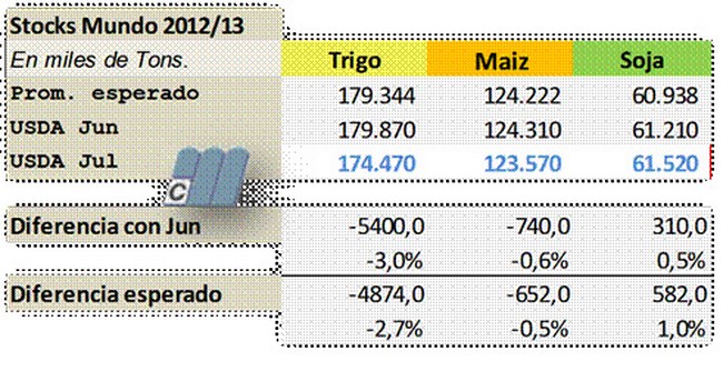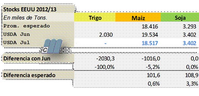 El jueves 11/7 el Departamento de Agricultura de los Estados Unidos (USDA, por sus siglas en inglés), difundió su nuevo informe mensual sobre oferta y demanda de granos en el nivel mundial, en el cual el organismo recortó las existencias de maíz 2012/2013, al tiempo que elevó los stocks de soja y maíz 2013/14 en Estados Unidos.