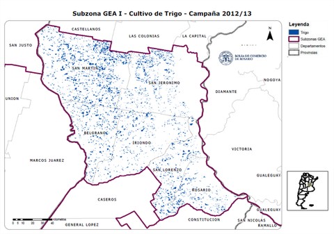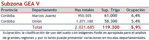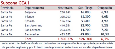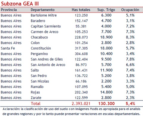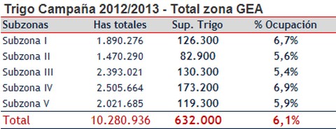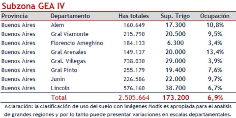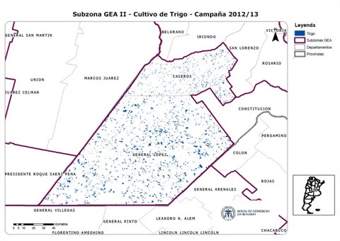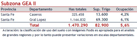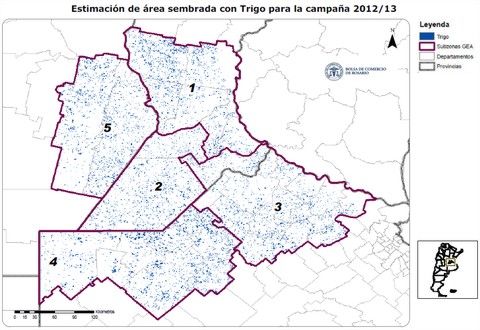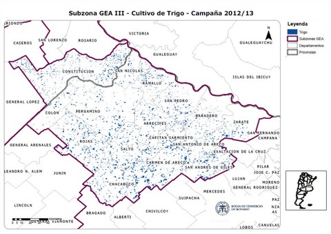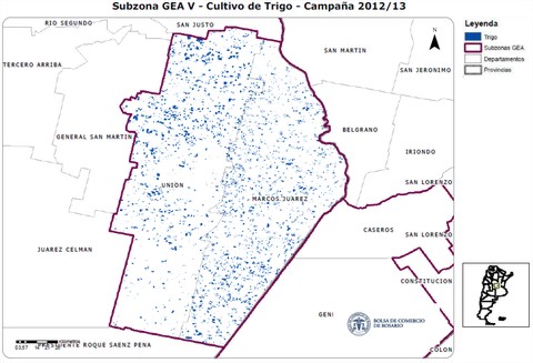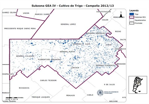 A partir de estimaciones propias, se calcula que la superficie afectada por problemas de inundación y granizo, en la campaña de trigo 2012/13, habría sido de 27.500 ha. Se estimó el rinde promedio de la región en 26,5 qq/ha, a partir de lo cual se estima que la producción de la región ascendió a 1,6 millón de toneladas. El trabajo hecho con la misma metodología para la campaña 2011/12 arrojó una cobertura total de trigo de 693.000 ha.