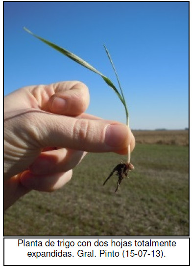 El área sembrada dicha campaña fue muy baja debido a los excesos hídricos que afectaron a la región, por tal motivo la superficie se incrementó aunque el productor decide realizar lo mínimo para mantener la rotación de los cuadros, ya que la rentabilidad de este cereal es muy ajustada y hasta en muchos casos negativa. En dicha región los cuadros sembrados de manera temprana comienzan a transitar la etapa de macollaje, mientras que el resto de los lotes se encuentran en emergencia o expandiendo 1–2 hojas.