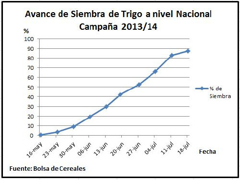 Cabe destacar que en esta última región se relevó un aumento en la superficie sembrada en comparación a la pasada campaña en detrimento del cultivo de cebada. En el Norte de La Pampa y Oeste de Buenos Aires las labores de implantación se encuentran próximas a culminar, en tanto se pudo relevar un aumento en la superficie triguera en comparación al ciclo 2012/13.
