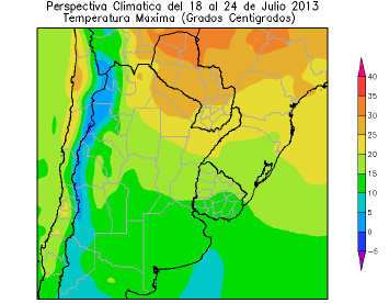 • La mayor parte de Salta, el sur de la Región del Chaco, el norte de la Mesopotamia, el nordeste de Santa Fe, el nordeste de Santiago del Estero, la mayor parte de Paraná, de Santa Catarina y el noroeste y el oeste de Río Grande do Sul, observarán temperaturas máximas entre 20 y 25ºC.