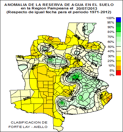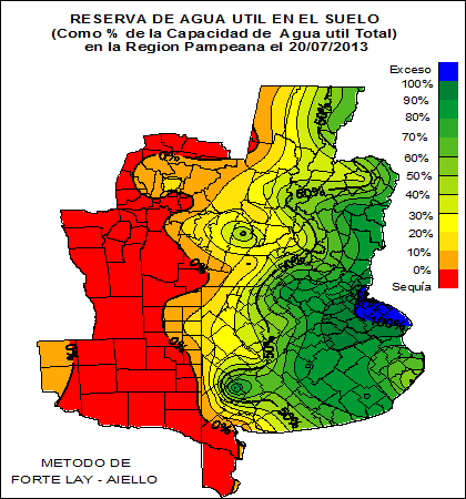 RESERVA DE AGUA ÚTIL EN EL SUELO (como % de la capacidad de agua útil total) en la Región Pampeana el 20 de Julio de 2013