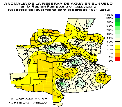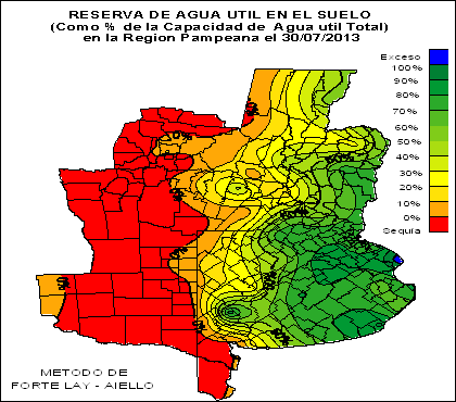 RESERVA DE AGUA ÚTIL EN EL SUELO (como % de la capacidad de agua útil total) en la Región Pampeana el 30 de Julio de 2013