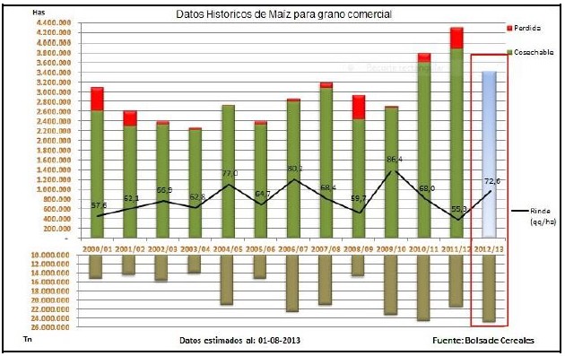 Para la campaña en curso (2012/13) nuestra proyección de producción se mantiene en 24.800.000 toneladas, con un rendimiento medio de 72,6 qq/Ha. De concretarse esto, registraría la mejor cosecha de la historia del maíz argentino, pero no así respecto del rendimiento medio nacional. Para este caso, se ubicaría en un cuarto escalón detrás de las campañas 2009/10= 86,4 qq/Ha; 2006/07= 80 qq/Ha; 2004/05= 77 qq/Ha.