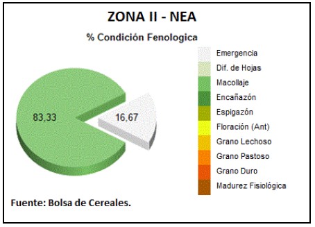 En el NEA, los lotes en secano refleja mejores condiciones que el NOA, gracias a reiteradas precipitaciones que se produjeron durante los últimos meses. En el NEA se puede apreciar cerca del 80 % de la superficie macollando, mientras que el área restante se encuentra en V2-V4.