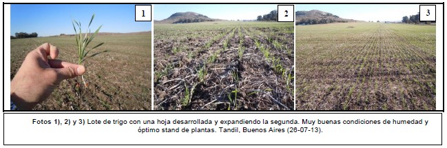 Hacia el sur cordobés, las bajas temperaturas también retrasaron el desarrollo, sin embargo se pueden apreciar lotes con óptimo stand de plantas y los más adelantados comenzando a macollar en buenas condiciones. Hacia el este, en el Centro-Norte de Santa Fe, los cuadros de ciclo corto expanden de 2 a 4 hojas (V2-V4), mientras que los ciclos largos transitan pleno macollaje, relevándose en general buenas condiciones de cultivo. En los Núcleos Norte y Sur los cuadros evolucionan de buena manera con adecuadas reservas de humedad.