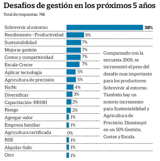 Otra de las particularidades a destacar con respecto a 2009 es que crecieron como desafíos de gestión de los productores la sustentabilidad y la agricultura de precisión. En cambio, los productores encuestados el año pasado ya no ven como desafíos prioritarios de su gestión lo relacionado con las cuestiones de escala y costos. ¿Será por los efectos distorsivos de la inflación?