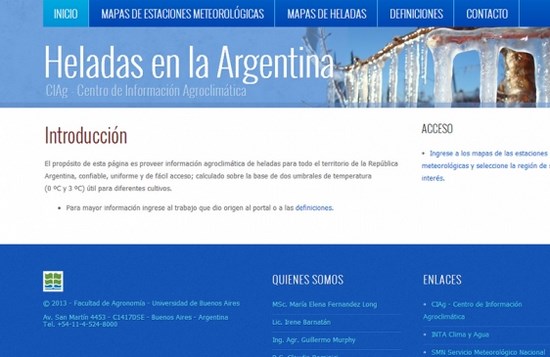 “Creamos un portal con información agroclimática de heladas. Trabajamos con datos del INTA y del Servicio Meteorológico Nacional”, aseguró la MSc. En Meteorología Agrícola, María Elena Fernández Long, integrante de la cátedra de Climatología y Fenología Agrícolas de la FAUBA, quien junto al Ing. Agr. Guillermo Murphy, titular de la cátedra, la Lic. Irene Barnatán, del Servicio Meteorológico Nacional (SMN), y la Diseñadora Gráfica, Claudia Dominici, directora de Comunicación de la Facultad, generaron esta página web que provee información confiable y uniforme, calculada sobre la base de dos umbrales de temperatura distintos (0 ºC y 3 ºC).