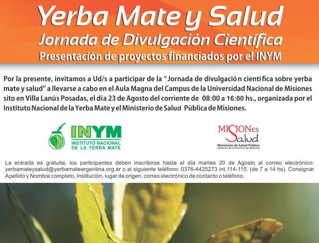 La Jornada de Divulgación Científica "Yerba Mate y Salud" organizada por el Instituto Nacional de la Yerba Mate (INYM), se llevará a cabo en el Aula Magna de la Facultad de Ciencias Económicas – Campus Universitario – UNaM- Posadas, Misiones, el día 23 de Agosto del 2013.