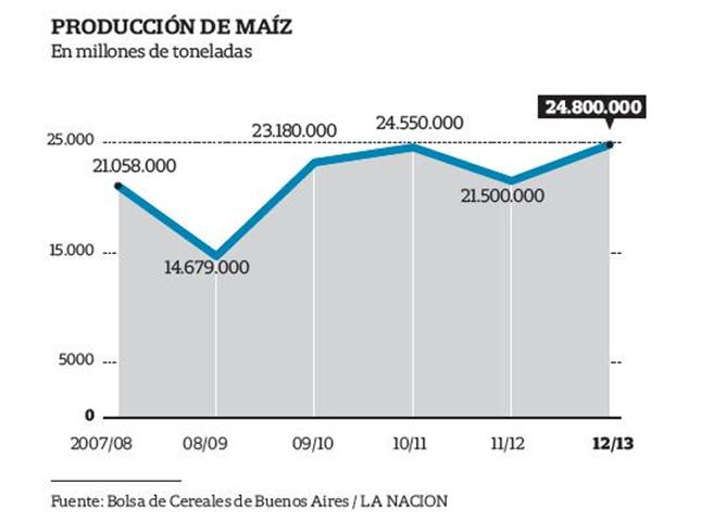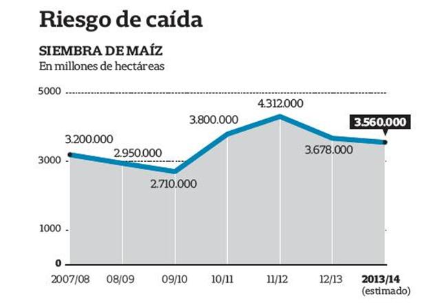 Al margen de esa proyección privada, en un informe de precampaña la Bolsa de Cereales de Buenos Aires calculó en 3.560.000 hectáreas la siembra para grano comercial del ciclo 2013/2014, una merma del 3% contra la campaña pasada. Según la entidad, el maíz ya había sufrido una caída del área del 14,7% el ciclo anterior.