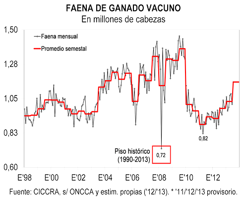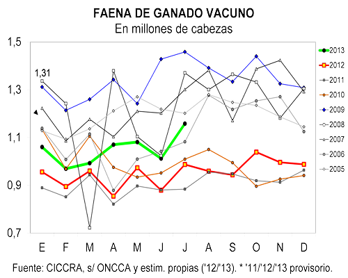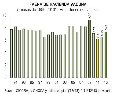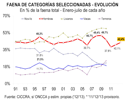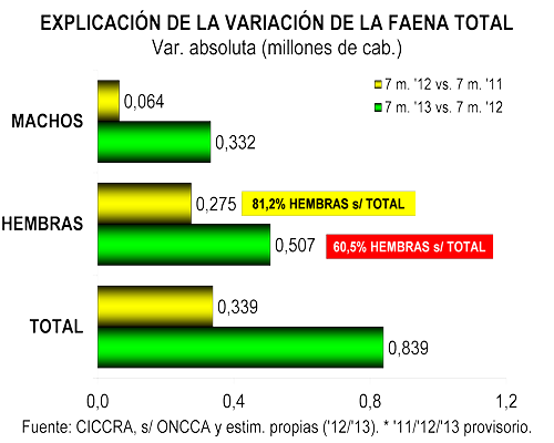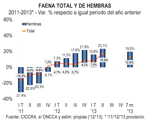 En el séptimo mes de 2013 la faena total creció 17,3% anual, producto de un aumento de la faena de hembras de 19,4% anual que se combinó con una suba de la de machos de 15,9% anual. Es decir, las hembras ganaron participación en la faena total, habiéndose cumplido dieciséis meses consecutivos en los cuales la expansión de la actividad sectorial estuvo explicada básicamente por el mayor crecimiento relativo de la faena de hembras.