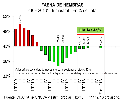 A medida que avanza el año se confirma la finalización de la fase de recomposición de existencias que se puso en marcha en la primavera de 2009. Según un informe de la Cámara de la Industria y Comercio de Carnes y Derivados de la República Argentina (CICCRA), por noveno mes consecutivo, la participación de las hembras en la faena total se ubicó próxima al valor crítico de 43%.